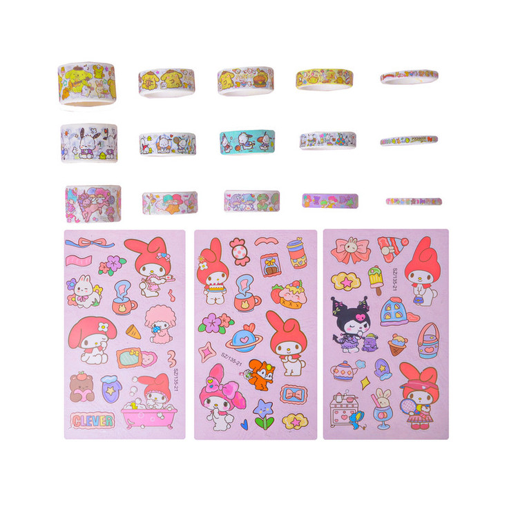 15 حلقه نوار چسب مدل واشی با عرض های مختلف و طرح کرومی و ملودی و دوستان به همراه 3 برگه استیکر کرومی و ملودی جمعا تعداد 18 عدد در یک بسته بندی مطابق با تصاویر