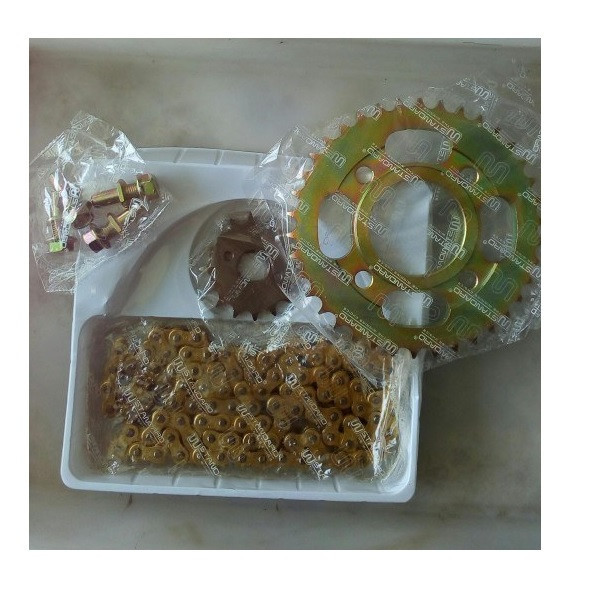 ست دنده زنجیر شامل : زنجیرـ دنده جلو ـ و دنده عقب و پیچ طبق میباشد تعداد دندانه های جلو ۱۶ ( برای شتاب بیشتر ) تعداد دندانه های عقب ۳۸