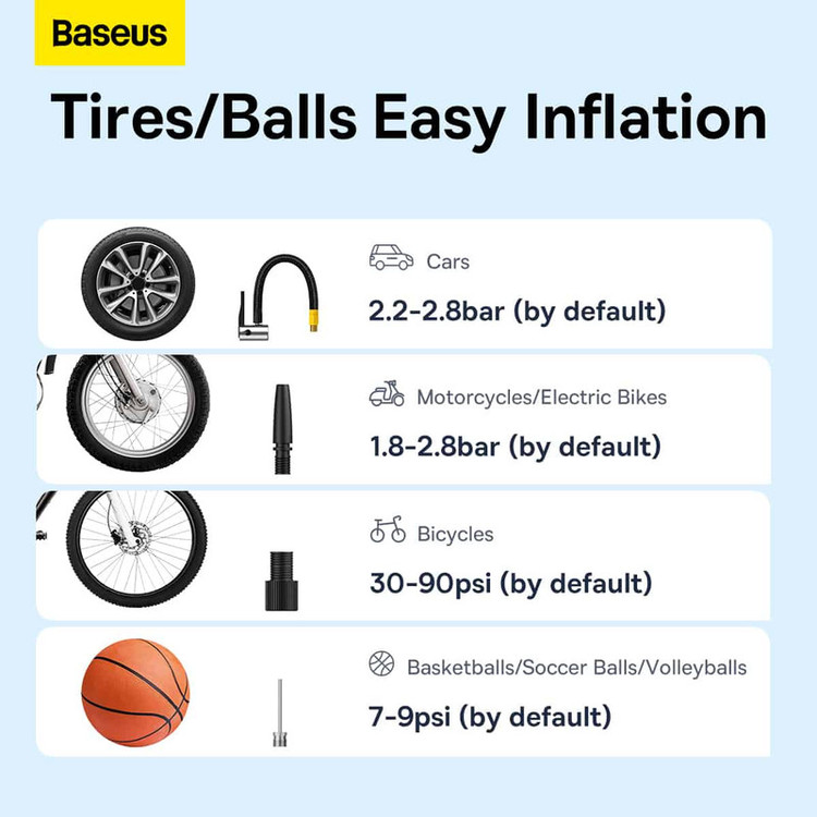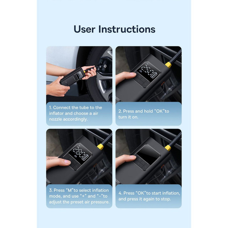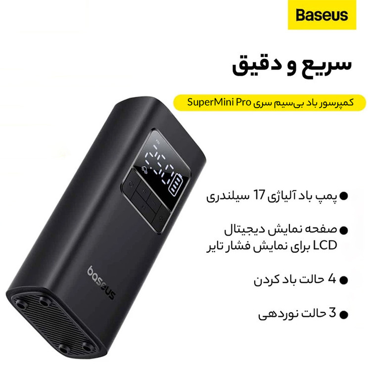 در داخل بسته بندی پمپ باد بیسوس علاوه بر کمپرسور باد، 3 نازل باد و کابل شارژ تایپ سی قرار دارد.