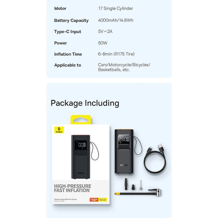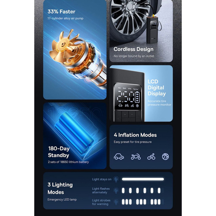 جنس ABS+PC / زمان باد کردن 6-8 دقیقه (لاستیک R175) / موتور تک سیلندر 17 میلیمتری / دارای چراغ LED قابل تنظیم در 3 حالت / صفحه نمایش دیجیتالی