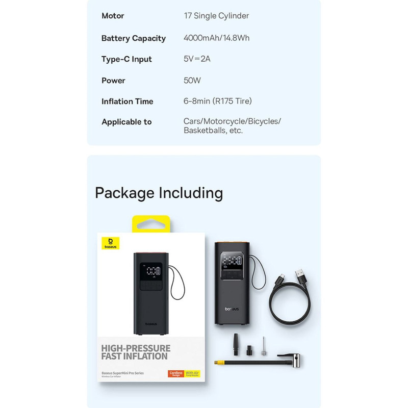 در داخل بسته بندی پمپ باد بیسوس علاوه بر کمپرسور باد، 3 نازل باد و کابل شارژ تایپ سی قرار دارد.