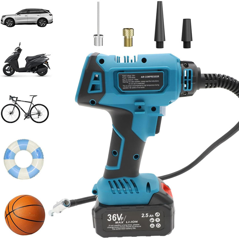 آداپتور، کابل تبدیل به فندکی، سه عدد سری (جهت باد زدن توپ، دوچرخه، قایق بادی و ...)