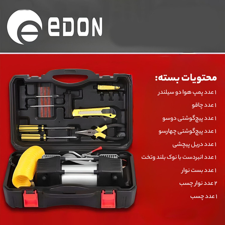 چسب لاستیک ابزار مخصوی پنچر گیری دم باریک پیچ گوشتی دوسو پیچ گوشتی چهار سو کاتر سیم مبدل فندکییک عدد پمپ باد ، شیلنگ 5 متری ، کیف نگه دارنده ، کاتالوگ