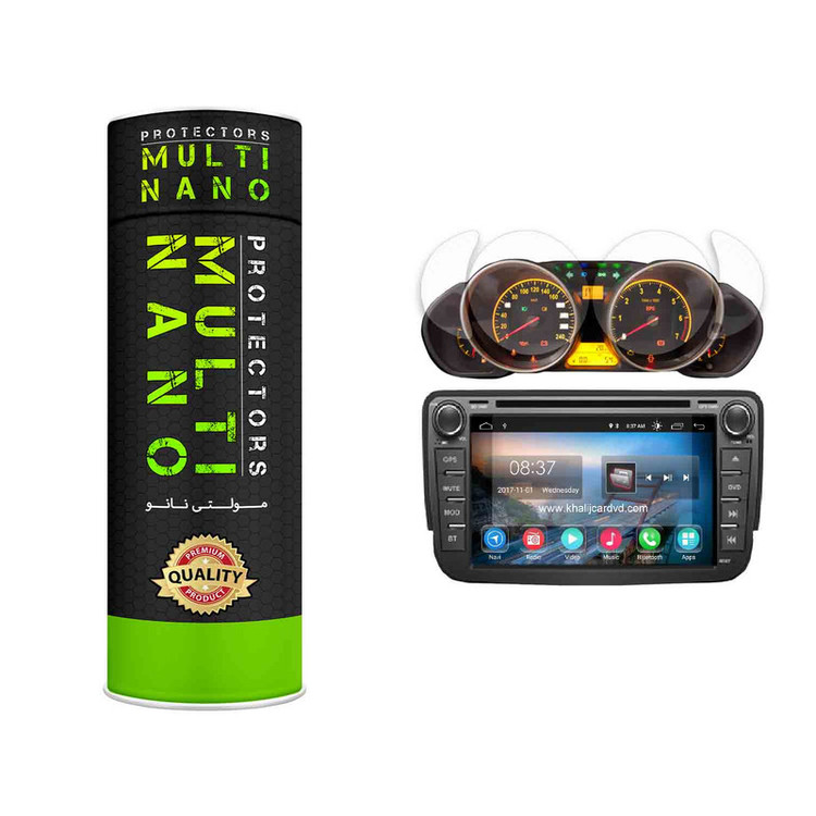 اقلام همراه: محافظ مانیتور و کیلومتر آنتی رفلکس - قوطی اسپری خالی - پد الکلی جهت تمیز کردن صفحه - دستمال نانو جهت خشک کردن - برچسب پرز بردار - کارت نصب - بروشور آموزش نصب