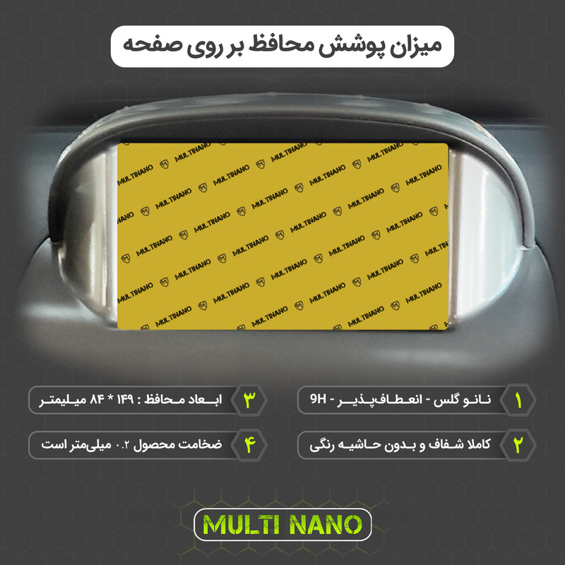 اقلام همراه: پد الکلی جهت تمیز کردن صفحه مانیتور - دستمال نانو جهت خشک کردن - برچسب پرز بردار - کارت نصب - بروشور آموزش نصب