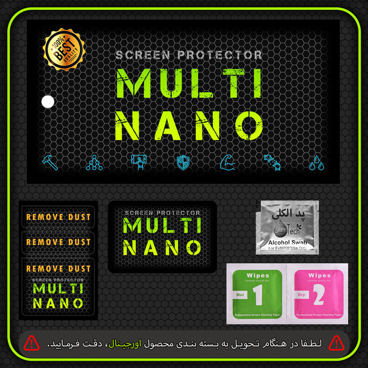 امروزه خودروها دارای دستگاه پخش هوشمند، با صفحه نمایش لمسی و ابعادی متنوع هستند و محافظت از این نوع مانیتور ها در برابر ضربات احتمالی و ایجاد خط و خش، یکی از مهمترین دغدغه های صاحبان خودرو به شمار می آید. شرکت مولتی نانو به صورت کاملا دقیق و با به روز ترین متد های اندازه گیری، محافظ هایی با ابعاد کاملا انحصاری برای نمایشگر های هوشمند خودروها طراحی ، تولید وعرضه کرده است. محافظ صفحه نمایش انعطاف پذیر نانو Multi Nano مناسب برای مالتی مدیا فابریک شرکت ایرانخودرو، خودرو دنا پلاس بوده و بر روی این مانیتور قابل نصب است. محافظ نمایشگر خودرو مولتی نانو، نسل جدید محافظ های صفحه نمایش، با ساختاری شفاف که از تکنولوژی نانو در ساخت آن استفاده شده و از ضخامت 0.2 میلی متری برخوردار میباشد(شیشه ای نمی باشد) و باعث مقاومت بسیار بیشتر در برابر ضربه نسبت به گلس های معمولی شده است، همچنین کاملا نشکن است و در صورت برخورد ضربه نخواهد شکست، و به مرور زمان کدر نخواهد شد و لمس آن با توجه به ساختار تکنولوژی روغنی بسیار آسان و روان است. توجه داشته باشید که این محصول دارای برچسب اول (قبل از نصب) و برچسب دوم (بعد از نصب) می باشد و داخل بسته بندی محصول برای سهولت در نصب، لوازم کامل به همراه آموزش نصب نیز وجود دارد.xxxشما میتوانید ویدئو معرفی دیگر محصولات و تست کوبیدن میخ در چوب با محافظ بعد از نصب (مقاومت محافظ در برابر ضربه) را در شبکه های مجازی و آپارات مشاهده کنیدxxx