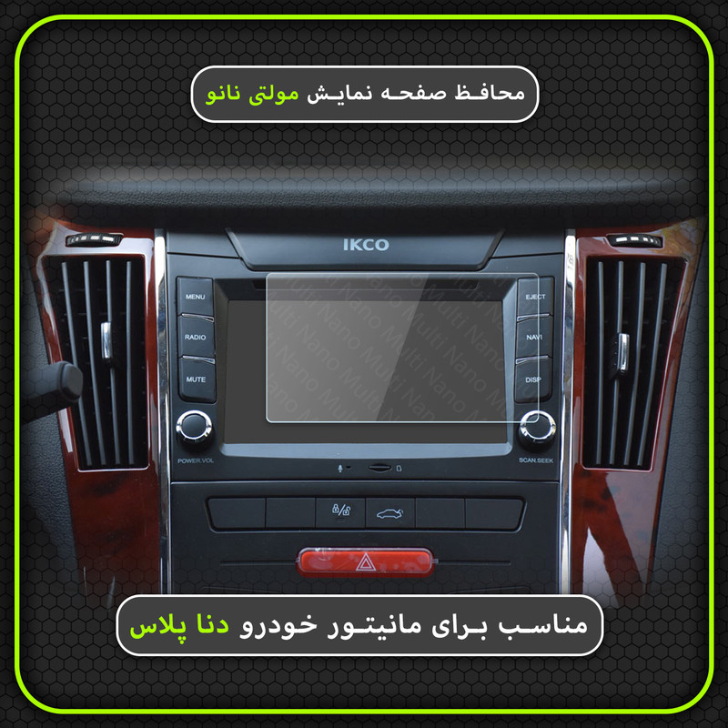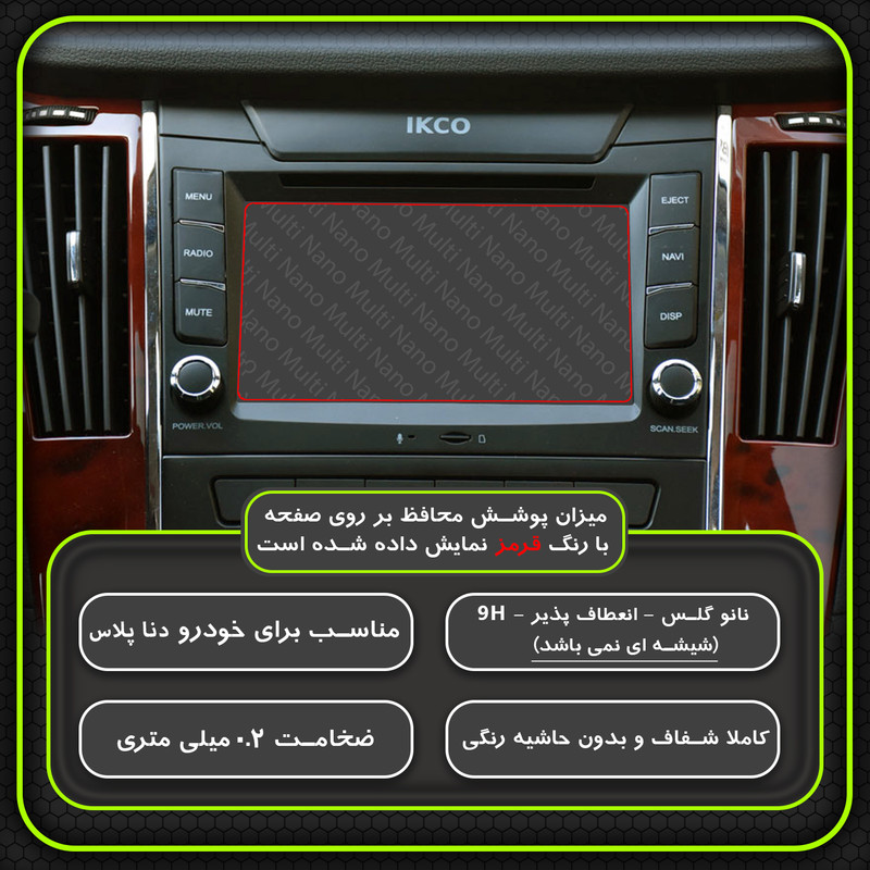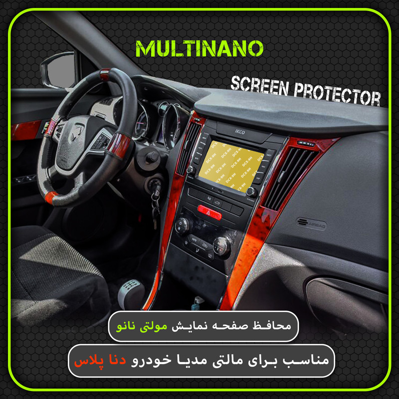 امروزه خودروها دارای دستگاه پخش هوشمند، با صفحه نمایش لمسی و ابعادی متنوع هستند و محافظت از این نوع مانیتور ها در برابر ضربات احتمالی و ایجاد خط و خش، یکی از مهمترین دغدغه های صاحبان خودرو به شمار می آید. شرکت مولتی نانو به صورت کاملا دقیق و با به روز ترین متد های اندازه گیری، محافظ هایی با ابعاد کاملا انحصاری برای نمایشگر های هوشمند خودروها طراحی ، تولید وعرضه کرده است. محافظ صفحه نمایش انعطاف پذیر نانو Multi Nano مناسب برای مالتی مدیا فابریک شرکت ایرانخودرو، خودرو دنا پلاس بوده و بر روی این مانیتور قابل نصب است. محافظ نمایشگر خودرو مولتی نانو، نسل جدید محافظ های صفحه نمایش، با ساختاری شفاف که از تکنولوژی نانو در ساخت آن استفاده شده و از ضخامت 0.2 میلی متری برخوردار میباشد(شیشه ای نمی باشد) و باعث مقاومت بسیار بیشتر در برابر ضربه نسبت به گلس های معمولی شده است، همچنین کاملا نشکن است و در صورت برخورد ضربه نخواهد شکست، و به مرور زمان کدر نخواهد شد و لمس آن با توجه به ساختار تکنولوژی روغنی بسیار آسان و روان است. توجه داشته باشید که این محصول دارای برچسب اول (قبل از نصب) و برچسب دوم (بعد از نصب) می باشد و داخل بسته بندی محصول برای سهولت در نصب، لوازم کامل به همراه آموزش نصب نیز وجود دارد.xxxشما میتوانید ویدئو معرفی دیگر محصولات و تست کوبیدن میخ در چوب با محافظ بعد از نصب (مقاومت محافظ در برابر ضربه) را در شبکه های مجازی و آپارات مشاهده کنیدxxx