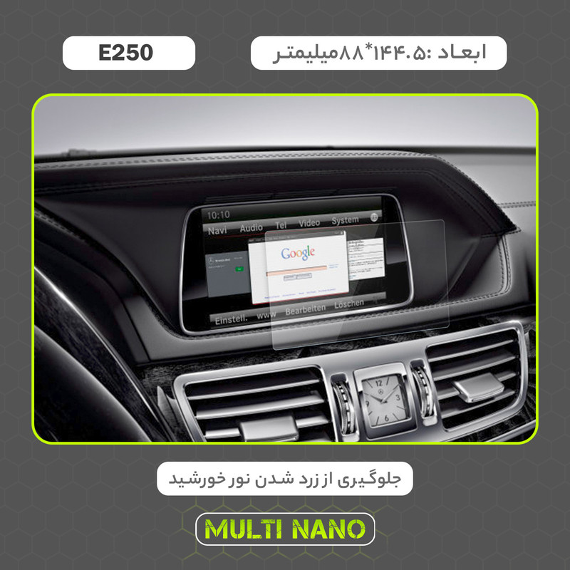 امروزه خودروها دارای دستگاه پخش هوشمند، با صفحه نمایش لمسی و ابعادی متنوع هستند و محافظت از این نوع مانیتور ها در برابر ضربات احتمالی و ایجاد خط و خش، یکی از مهمترین دغدغه های صاحبان خودرو به شمار می آید. شرکت مولتی نانو به صورت کاملا دقیق و با به روز ترین متد های اندازه گیری، محافظ هایی با ابعاد کاملا انحصاری برای نمایشگر های هوشمند خودروها طراحی ، تولید وعرضه کرده است. محافظ صفحه نمایش انعطاف پذیر نانو Multi Nano مناسب برای مانیتور خودرو (مرسدس بنز E250 2014) بوده و روی تمامی مانیتورهای این خودرو از جمله مانیتورهای رایان فن کاو اندیش، کروز و سیمیا الکترونیک قابل نصب است. محافظ نمایشگر مولتی نانو، نسل جدید محافظ های صفحه نمایش، با ساختاری شفاف که از تکنولوژی نانو در ساخت آن استفاده شده و از ضخامت 0.2 میلی متری برخوردار میباشد(شیشه ای نمی باشد) و باعث مقاومت بسیار بیشتر در برابر ضربه نسبت به گلس های معمولی شده است، همچنین کاملا نشکن است و در صورت برخورد ضربه نخواهد شکست، و به مرور زمان کدر نخواهد شد و لمس آن با توجه به ساختار تکنولوژی روغنی بسیار آسان و روان است. توجه داشته باشید که این محصول دارای برچسب اول (قبل از نصب) و برچسب دوم (بعد از نصب) می باشد و داخل بسته بندی محصول برای سهولت در نصب، لوازم کامل به همراه آموزش نصب نیز وجود دارد.