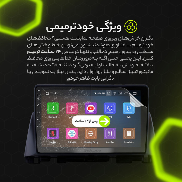 اقلام همراه: محافظ مانیتور و کیلومتر آنتی رفلکس - قوطی اسپری خالی - پد الکلی جهت تمیز کردن صفحه - دستمال نانو جهت خشک کردن - برچسب پرز بردار - کارت نصب - بروشور آموزش نصب