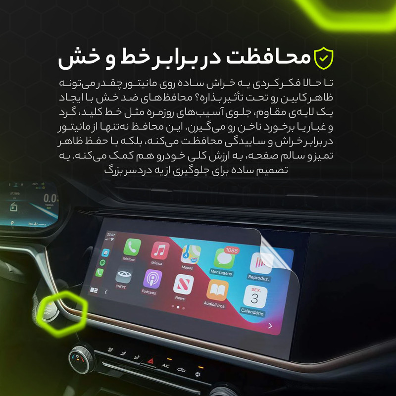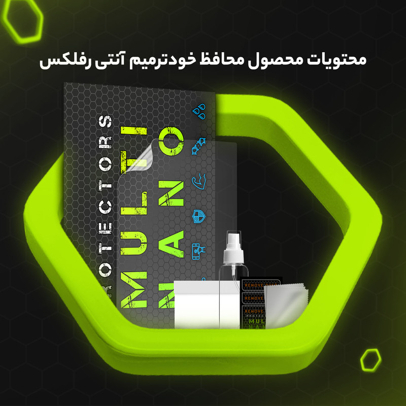 اقلام همراه: محافظ مانیتور و کیلومتر آنتی رفلکس - قوطی اسپری خالی - پد الکلی جهت تمیز کردن صفحه - دستمال نانو جهت خشک کردن - برچسب پرز بردار - کارت نصب - بروشور آموزش نصب