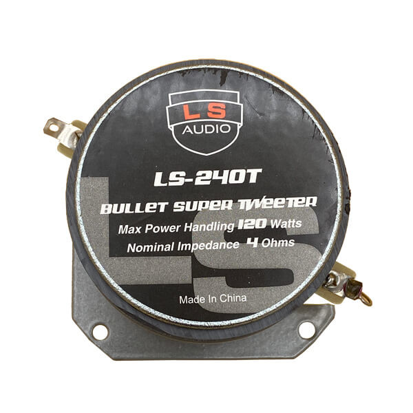 مشخصات فنی سوپرتیوتر ال اس آدیو LS-240T: سایز این سوپر تیوتر 3 اینچ می باشد. توان اسمی این سوپر تیوتر 120 وات می باشد. مقاومت(امپدانس) این سوپر تیوتر 4 اهم می باشد. این سوپر تیوتر دارای حساسیت 105 دیسیبل و واکنش فرکانس 3KHz-20KHz می باشد. جنس بدنه این سوپر تیوتر آلومینیومی می باشد که باعث افزایش دوام و کاهش نویز می شود.