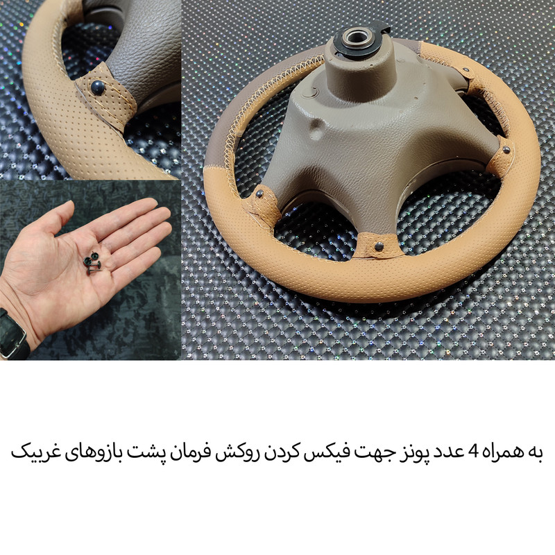 نصب دور فرمان بازودار دوختنی دقیقا مانند مدل های بدون بازو و ساده می باشد و نیازی به باز کردن فرمان و ایربگ و همچنین نیاز به استفاده از چسب برای فیکس کردن دورفرمان نمی باشد.