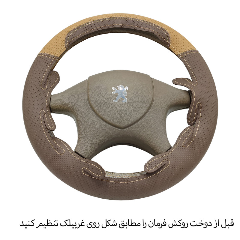 برای نصب این کالا قسمت پایین روکش فرمان را جا انداخته و از دو زانو برای نگه داشتن دور فرمان به روی غربیلک فرمان کمک می گیریم و بقیه قسمتهای فرمان را به آرامی به روی فرمان می کشیم. توجه کنید که این دورفرمان باید حدود 20 سانتیمتر کشیده شود تا روی فرمان جا بیافتاد .( که البته به دلیل خاصیت کشسانی چرم مصنوعی استفاده شده در این کالا ،کار ساده ایست.)