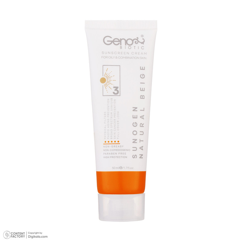 کرم ضد آفتاب مخصوص پوست چرب بژ طبیعی ژنوبایوتیک، با محافظت قوی پوست از لایههای اپیدرم پوستی و برخورداری از خاصیت آنتی باکتریال و ضدالتهاب بصورت یکی از بهترین ضدآفتابهای موجود در بین تولیدات داخلی معرفی شده که با برخورداری از فیلترهای UVA و UVB و IR از پوست در برابر اشعههای مضر و پیری پوست محافظت میکند. این محصول با ساختار سبک و بدون چربی در برابر تعریق و آب مقاوم بوده همچنین با پوششدهی مناسب همانند کرمپودر گزینهی مناسبی برای پوست چرب، مختلط و آکنهای محسوب میشود. کرم ضد آفتاب مخصوص پوست چرب بژ طبیعی Geno Biotic، با افزایش رطوبترسانی پوست بهترین راه برای جلوگیری از ایجاد چین و چروک و حفظ شادابی پوست شناخته شده همچنین با ترکیبات موثری همچون عصاره آفتابگردان، گل مغربی، آلوئهورا و ویتامین E لایهای محافظ روی پوست ایجاد میکند که با جذب سریع با خنثی کردن اثرات مضر رادیکالهای آزاد از بروز لکهای پوستی پیشگیری میکند.