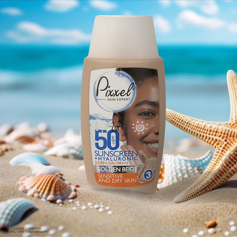 کرم ضد آفتاب رنگی پیکسل، 50 SPF، مدل GOLDEN BEIGE، مناسب پوست نرمال، خشک و حساس تنالیته رنگ تیره و حجم 50 میلیلیتر، محافظت کننده در برابر اشعه UVA و UVB، ضد حساسیت، +++ PA، آبرسان، با ماندگاری 2 ساعته