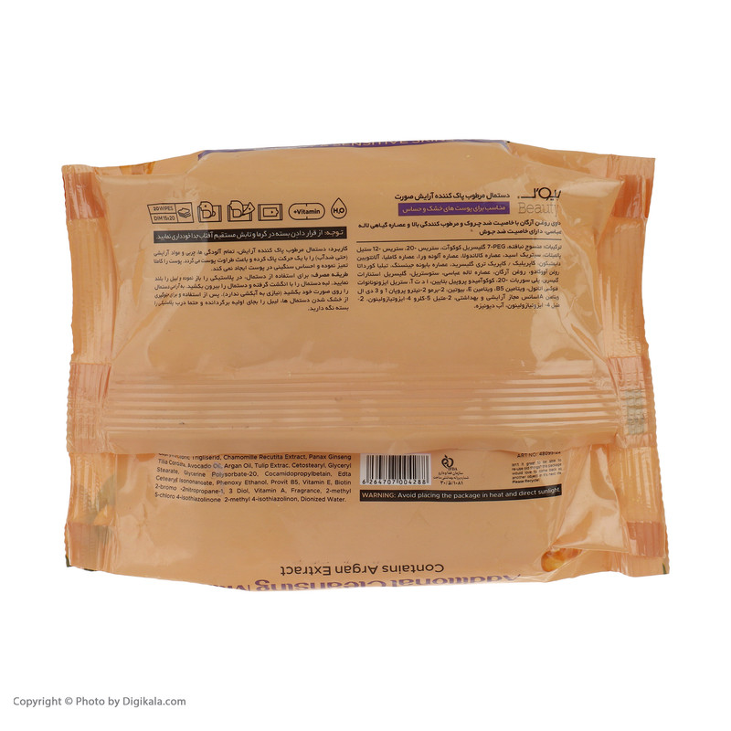 دستمال مرطوب آرایشی مخصوص پوست های خشک و حساس حاوی آرگان و عصاره لاله عباسی ضد چروک، با شیرکرمی مضاعف