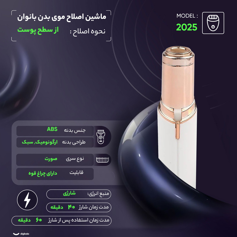 اپیلاتور شارژی مدل 2025 دستگاهی سبک، زیبا و قابل حمل است که امکان استفاده در هر زمان و مکان را فراهم میکند و به دلیل ابعاد کوچک، بهراحتی میتوان آن را در کیف همراه داشت. طراحی ارگونومیک و استفاده از متریال باکیفیت، تجربهای ایمن و دقیق برای حذف موهای زائد ایجاد میکند. این دستگاه با تیغههای چرخشی مشابه ماشین ریشتراش عمل کرده و با روشن شدن، تیغهها در حالت چرخشی قرار گرفته و موهای زائد صورت را بهآسانی از بین میبرد. سری الماسی هیپوآلرژنیک و ملایم آن، بدون ایجاد سوزش، درد یا قرمزی، برای انواع پوست مناسب است. توانایی حذف حتی ریزترین و درشتترین موها، این موزن را به گزینهای کاربردی بهویژه برای اصلاح موهای صورت بانوان تبدیل میکند. با طراحی جمعوجور و ظاهری مشابه لوازم آرایشی، این ابزار میتواند همراهی ضروری برای هر بانوی خوشسلیقه باشد.