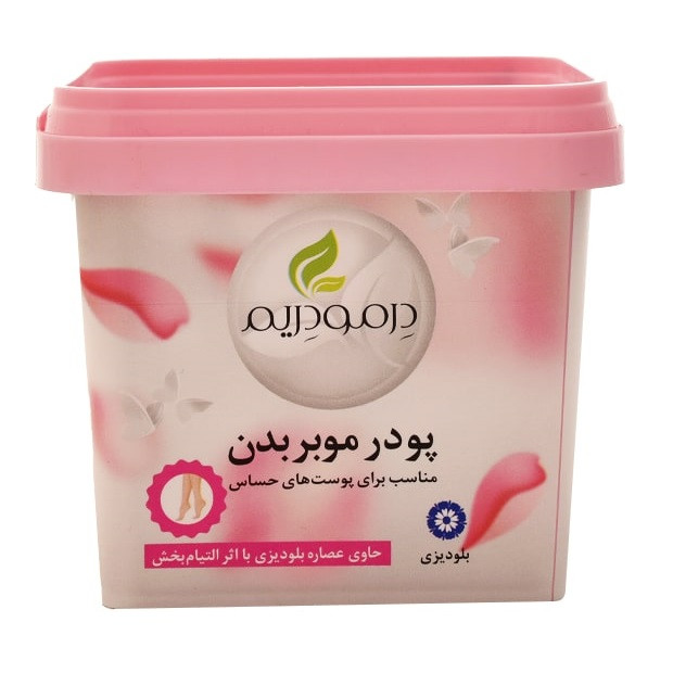 پودر موبر اقتصادی درمودریم حاوی عصاره گیاه بلودیزی با اثر التیام بخش مخصوص پوست های حساس بوده و برای انواع پوست ها مناسب می باشد.این پودر بسیار با کیفیت و موثر ازبرند درمودریم برای تمام بدن قابل استفاده است و با اثر گذاری فوری و سریع شما را از شر موهای زائد بدنتان رهایی می دهد. این محصول دارای حجم زیاد و قیمت مناسب می باشد که تا مدت ها خیال شما را از مو های زائدتان راحت می نماید. این پودر علاوه بر جداسازی مو های زائد از پوست ، رشد دوباره آنها را نیز کم می کند و پوست لطیف تری را برای شما به ارمغان می آورد. ظرف محصول حاوی 6 عدد ساشه پودر همراه ظرف و کاردک می باشد. این محصول با ترکیبات منحصر بفردی که دارد دارای خاصیت ضد حساسیت بوده و با اکثریت پوست ها سازگار می باشد. به سرعت اثرگذاری خود را نشان می دهد و در زمان کوتاهی سخت ترین مو های زائد شما را از سطح پوستتان پاک می نماید. این محصول بر خلاف اکثر پودر های موجود در بازار که بوی نامطبوعی دارند، دارای ترکیبات گیاهی و رایحه و عطر دلپذیری می باشد.