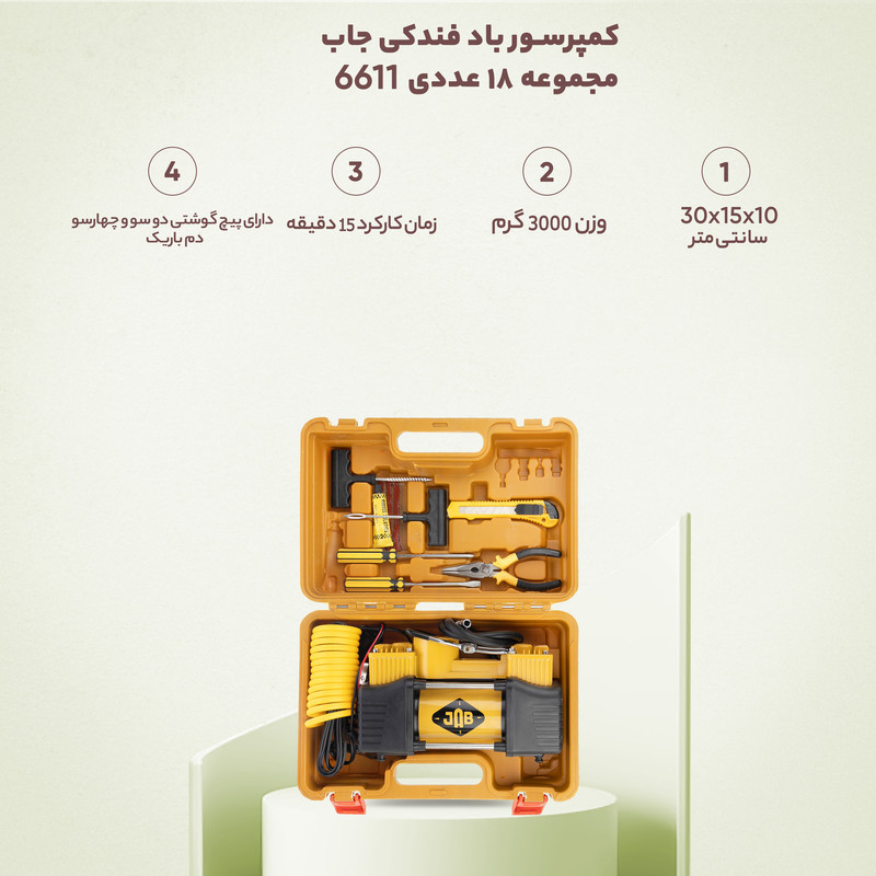 - ولتاژ 12 ولت - حداکثر فشار 150psi - حداکثر جریان 25 آمپر - حداکثر توان 300 وات - خروجی هوا 60 لیتر بر دقیقه - زمان کارکرد 15 دقیقه - طول سیم 3 متر