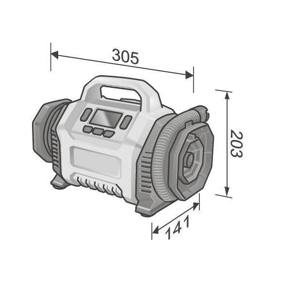 اقلام همراه : 1 عدد شلنگ برای فشار بالا به طول 70 سانتیمتر-1عدد شلنگ برای حجم بالا به طول 35 سانتیمتر-1 عدد آداپتور برای لاستیک ماشین-3 عدد آداپتور برای دوچرخه،باد کردن توپ و باد کردن تشک بادی - فاقد باتری و شارژر