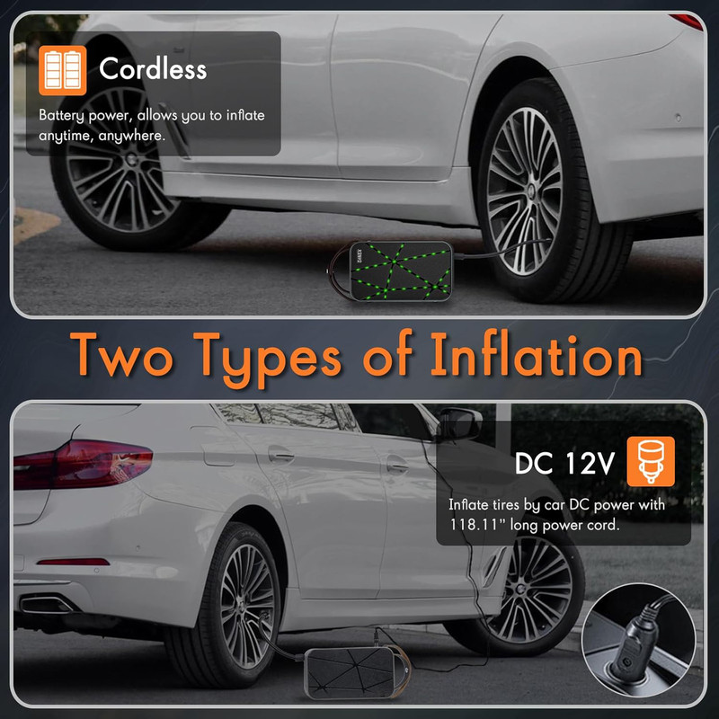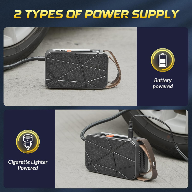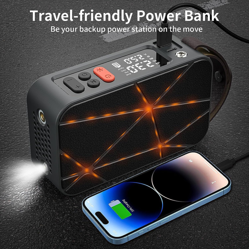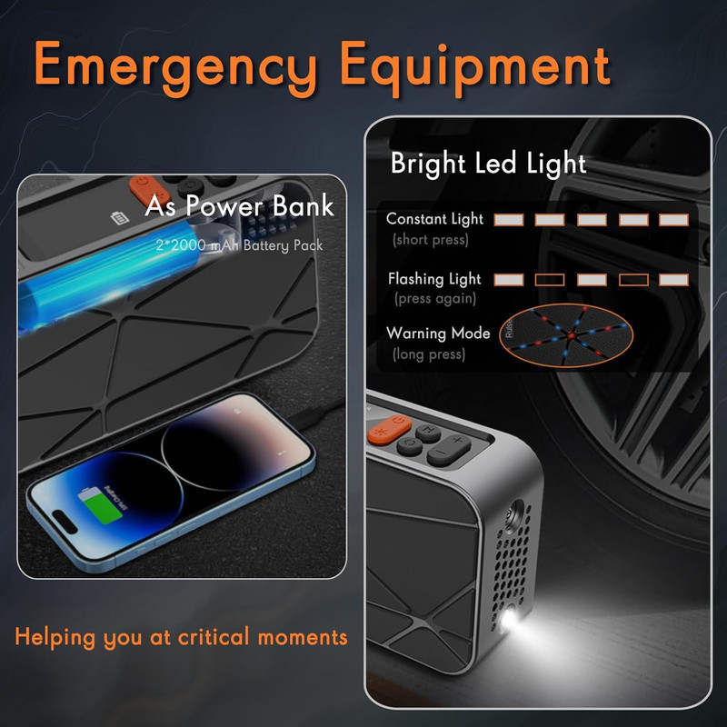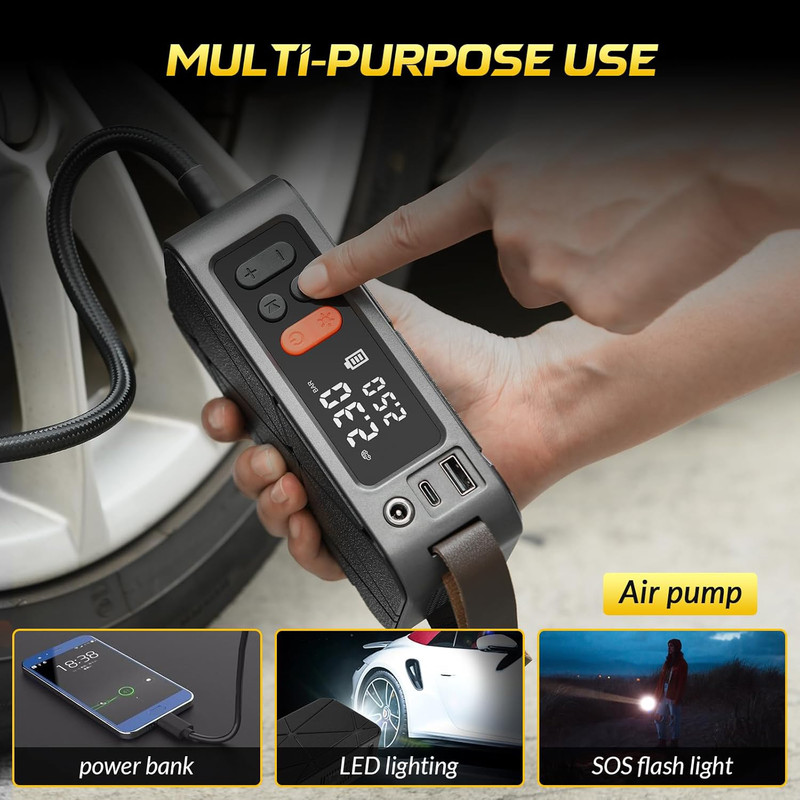 پمپ باد: این پمپ باد برای باد کردن لاستیک خودرو، موتورسیکلت، دوچرخه، توپ و سایر وسایل بادی طراحی شده است. با باتری داخلی قابل شارژ، میتوانید بدون نیاز به منبع برق خارجی از آن استفاده کنید. همچنین، در صورت اتمام شارژ باتری، امکان اتصال به فندکی خودرو برای استفاده مداوم وجود دارد.