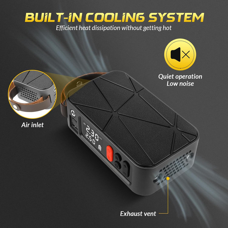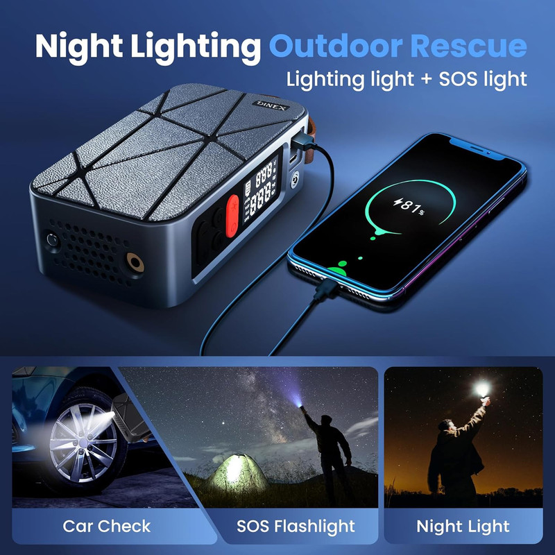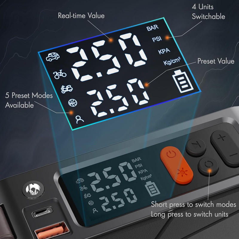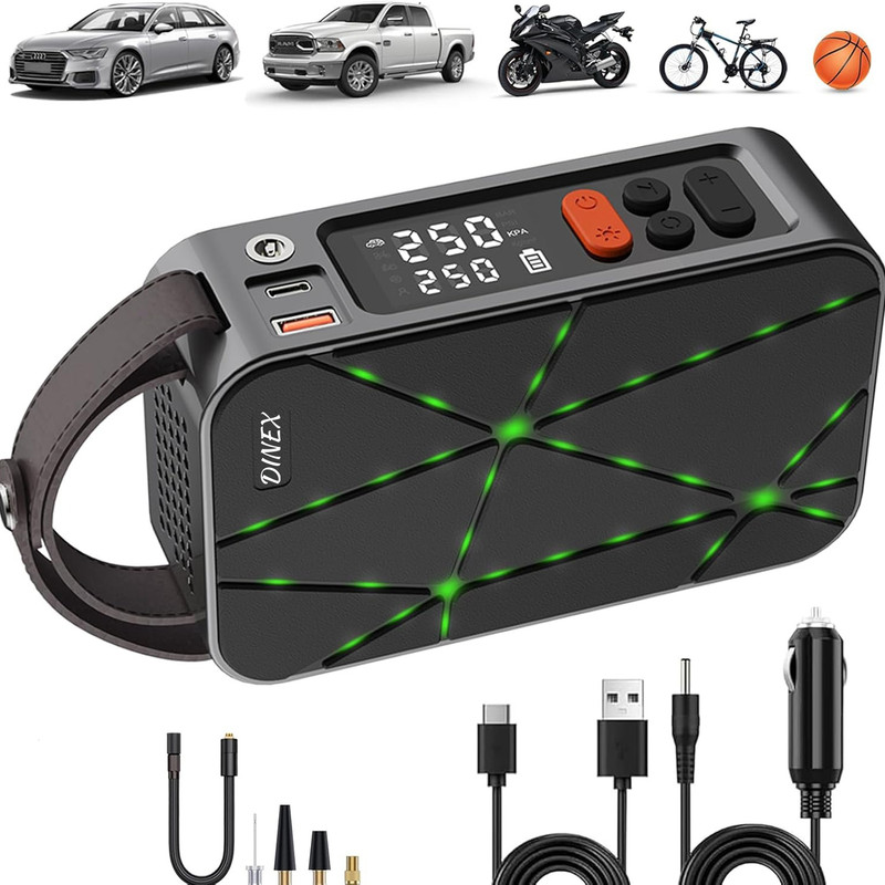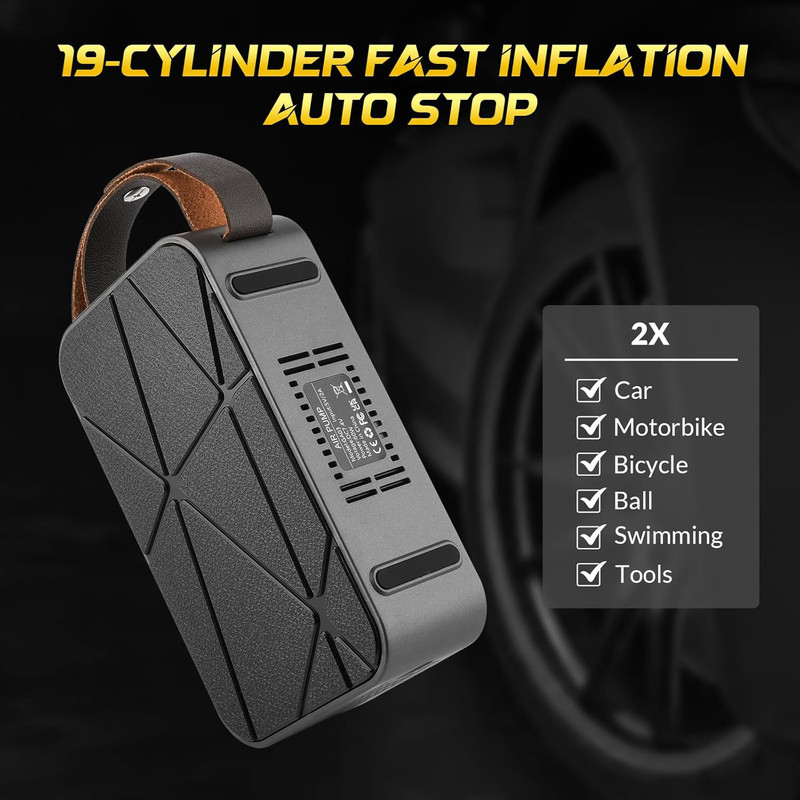 پمپ باد: این پمپ باد برای باد کردن لاستیک خودرو، موتورسیکلت، دوچرخه، توپ و سایر وسایل بادی طراحی شده است. با باتری داخلی قابل شارژ، میتوانید بدون نیاز به منبع برق خارجی از آن استفاده کنید. همچنین، در صورت اتمام شارژ باتری، امکان اتصال به فندکی خودرو برای استفاده مداوم وجود دارد.