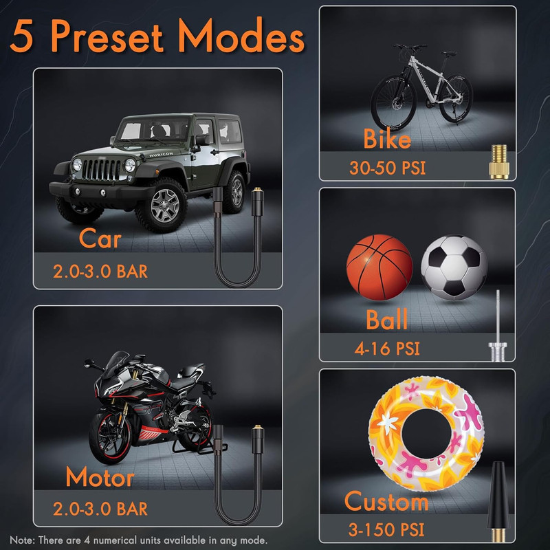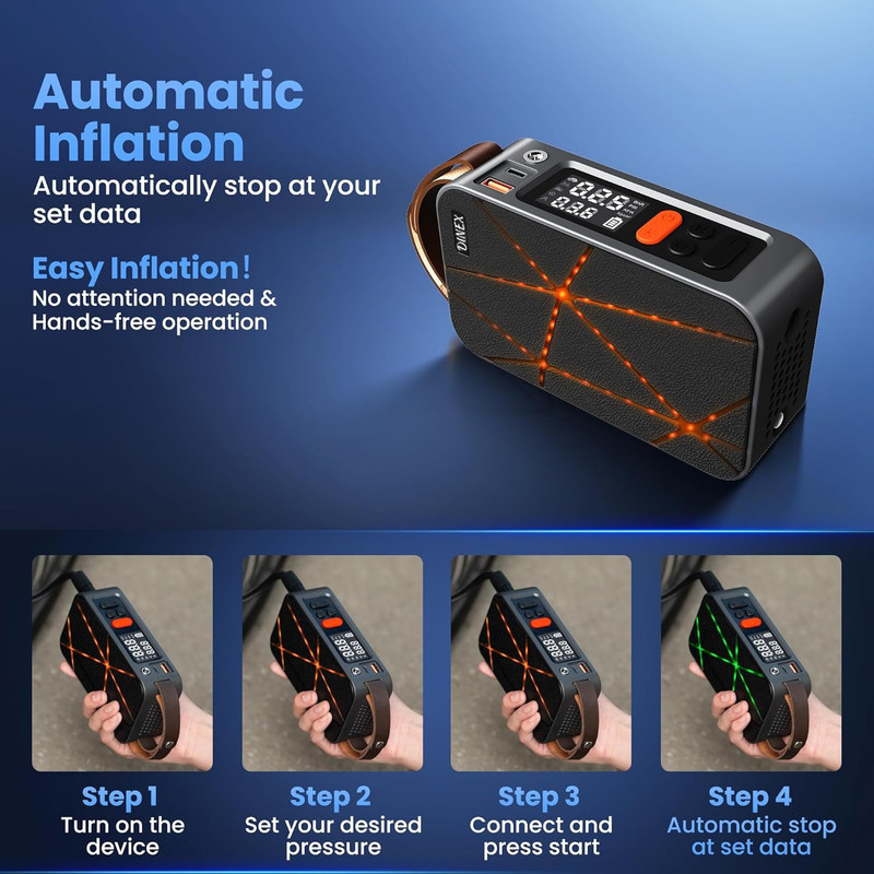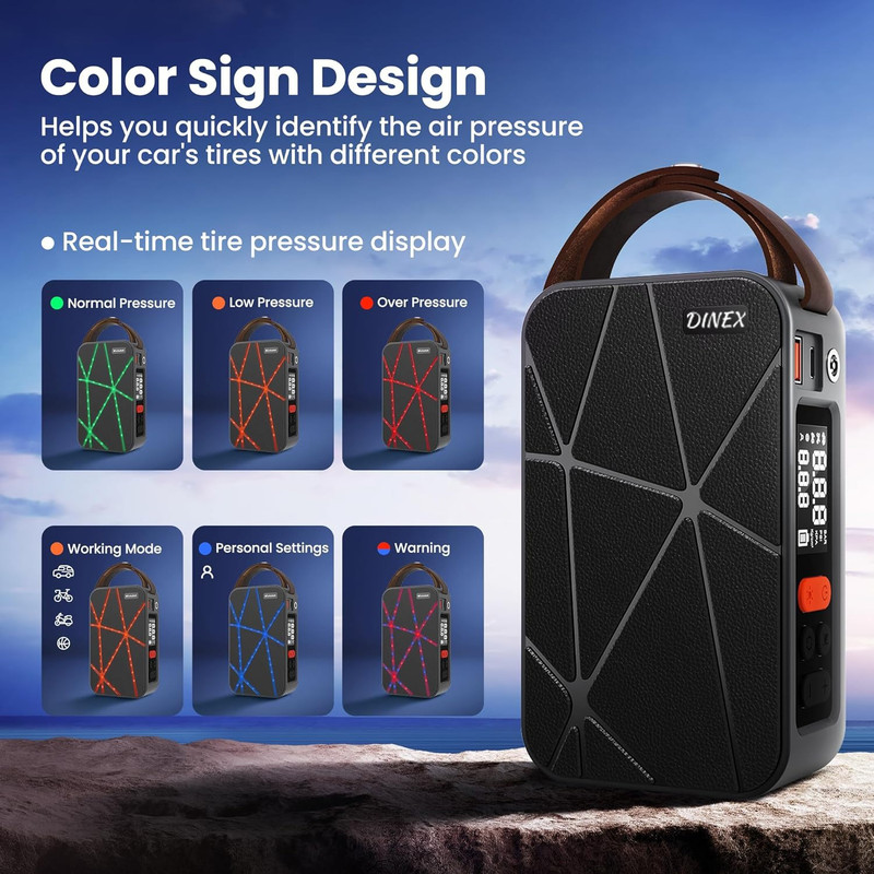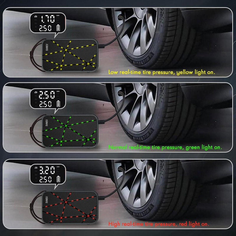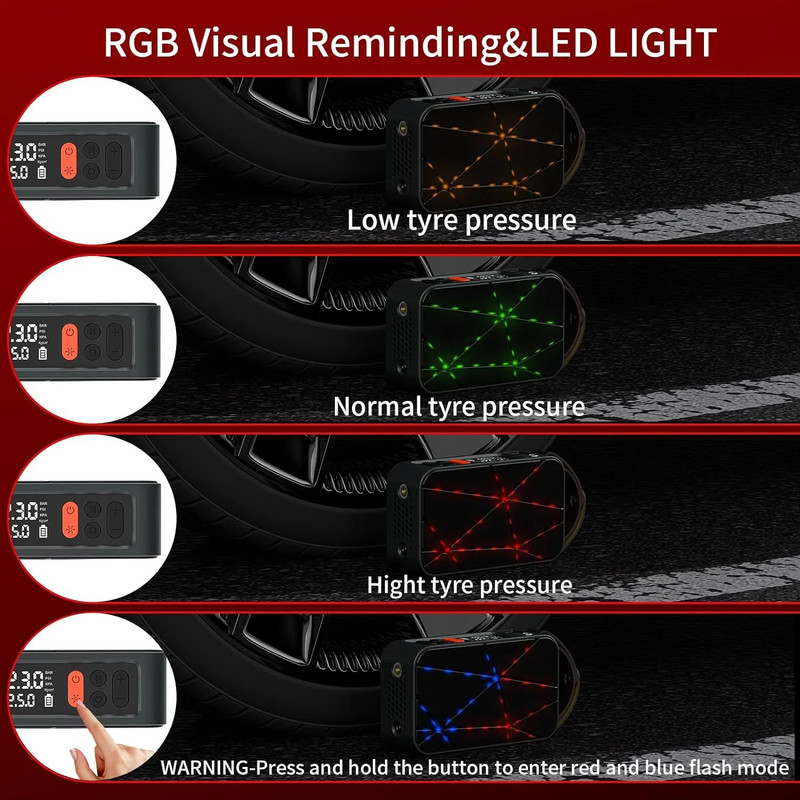 نمایشگر وضعیت باد با لامپهای رنگی: این محصول مجهز به لامپهای تزئینی است که با رقص نور در حین باد کردن، وضعیت فشار باد را نشان میدهد: رنگ متفاوت برای باد کم، مناسب یا زیاد.